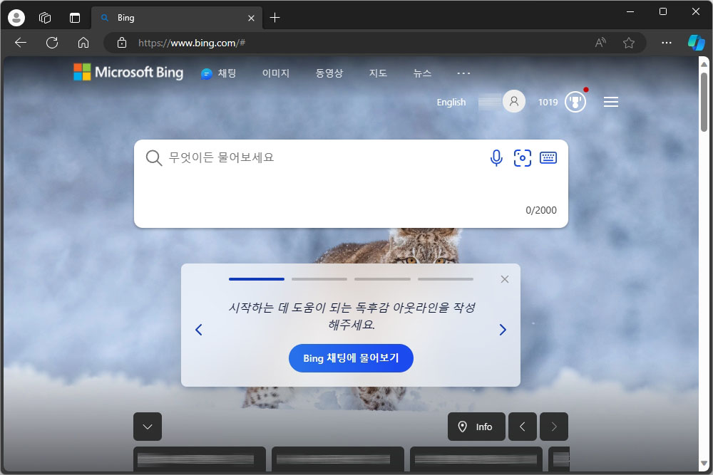 가장 먼저 www.bing.com 홈페이지에 접속한 후에 오른쪽 위에 있는 계정 관리를 선택해 주어야 합니다. 만약 로그인되어 있지 않다면 마이크로소프트 계정으로 로그인을 진행해 주면 됩니다.