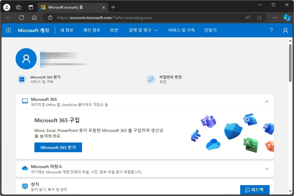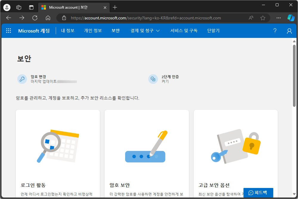 Microsoft 계정 정보를 확인해 보면 현재 구독 중인 서비스들의 리스트를 확인할 수 있습니다. 그리고 상단에 배치된 보안 메뉴를 살펴보면 암보 변경을 언제 진행했는지와 2단계 인증 켜기와 같은 기능을 확인할 수 있습니다.
