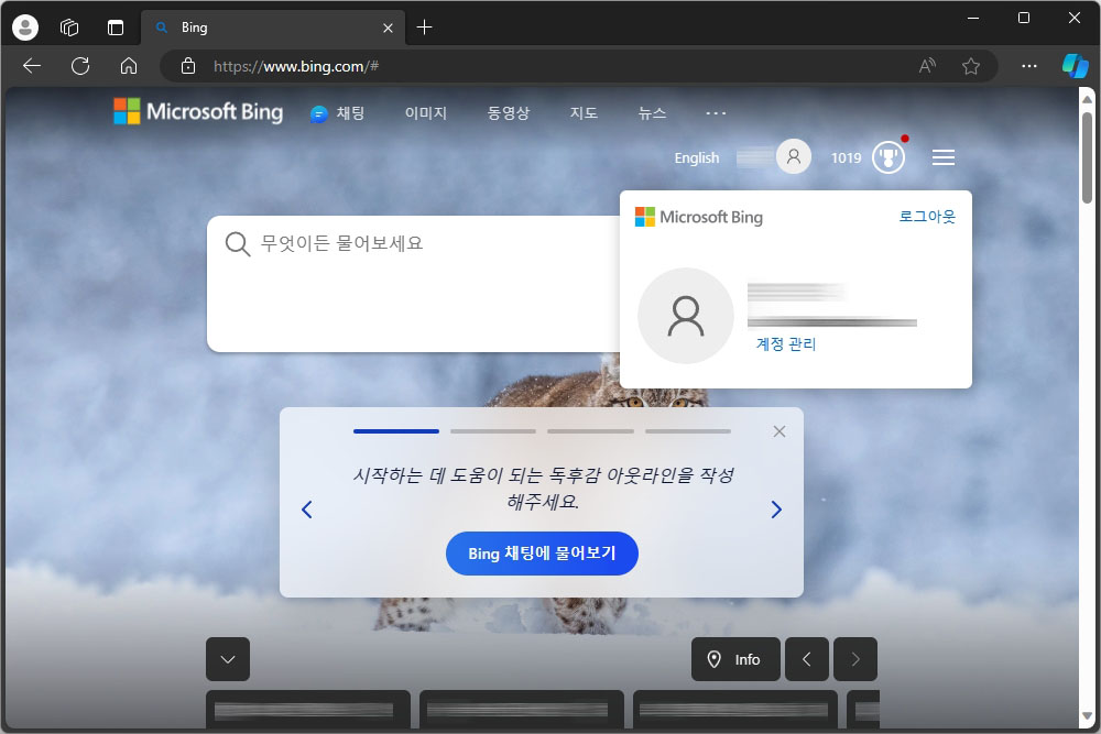 가장 먼저 www.bing.com 홈페이지에 접속한 후에 오른쪽 위에 있는 계정 관리를 선택해 주어야 합니다. 만약 로그인되어 있지 않다면 마이크로소프트 계정으로 로그인을 진행해 주면 됩니다.