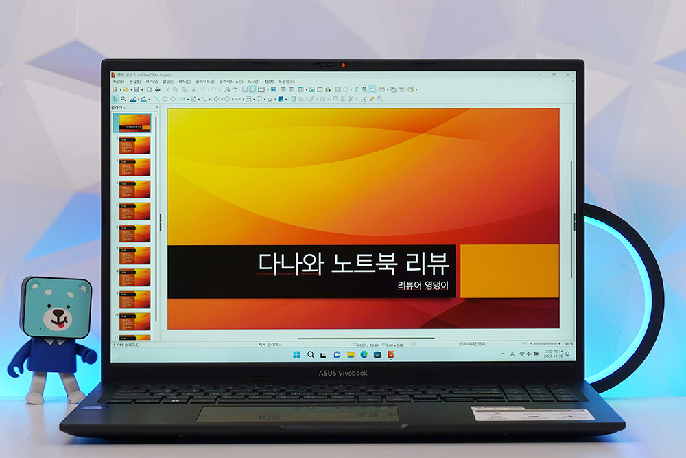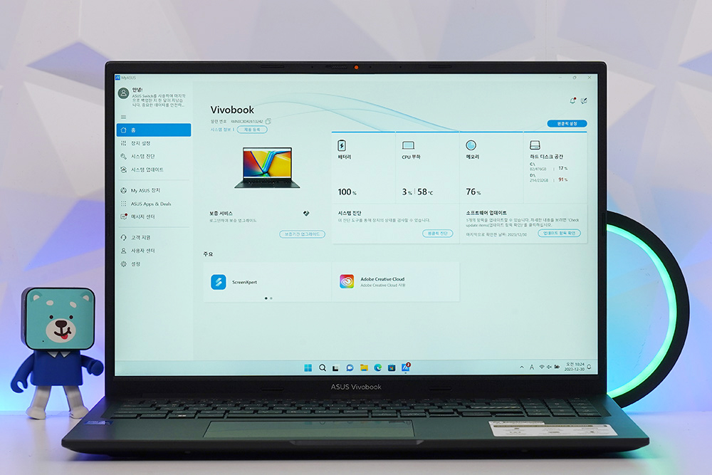 그리고 디스플레이를 자세하게 살펴보면 3면 나노 엣지가 적용되어서 스크린 대 바디 비율이 86%일 정도로 슬림한 베젤을 가지고 있습니다. 그래서 콘텐츠에 더욱 몰입할 수 있는 것은 물론이고 노트북의 크기도 상대적으로 콤팩트하다는 느낌을 받을 수 있습니다. 그리고 ASUS 웹캠 실드가 적용되어서 있어서 카메라를 물리적으로 차단하고 프라이버시를 보호할 수 있습니다.