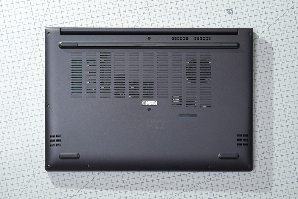 ASUS 비보북 16X K3604VA-MB145의 바닥을 살펴보면 모서리 부분에 고무 지지대가 배치되어 있어서 책상 위에서 잘 미끄러지지 않습니다. 그리고 위쪽에 쿨링 솔루션이 탑재되었습니다.