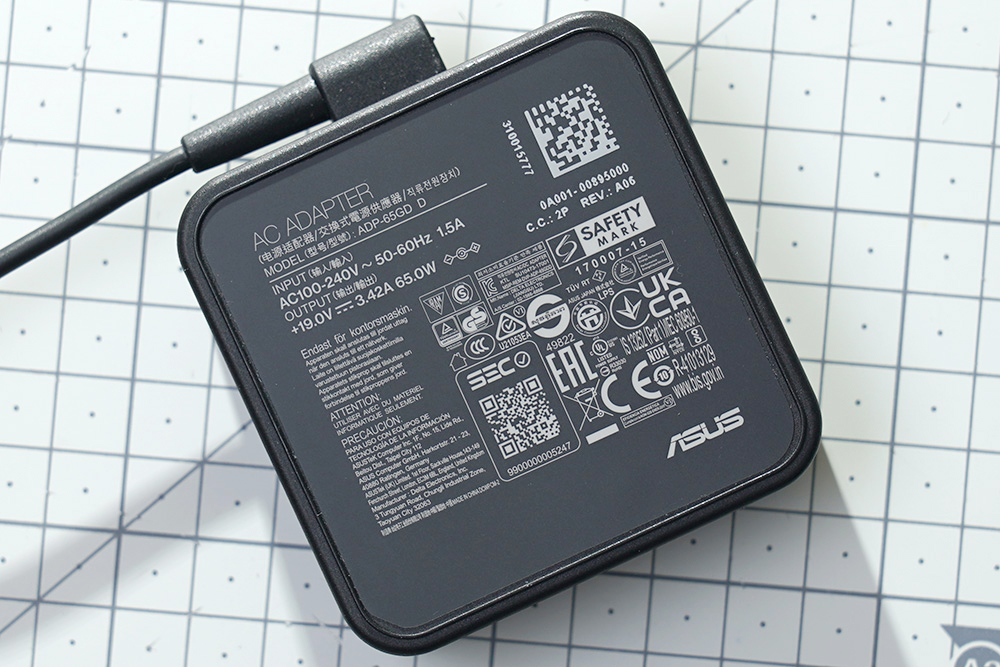 ASUS 비보북 16X K3604VA-MB145의 어댑터는 콤팩트한 크기로 제작되어서 노트북과 함께 부담 없이 휴대할 수 있습니다.(표면에 독특한 형태의 패턴의 각인이 있다는 점이 재미있는 부분입니다) 그리고 스펙을 살펴보면 프리볼트 입력을 지원해서 해외에서도 사용할 수 있고 출력은 65W입니다.