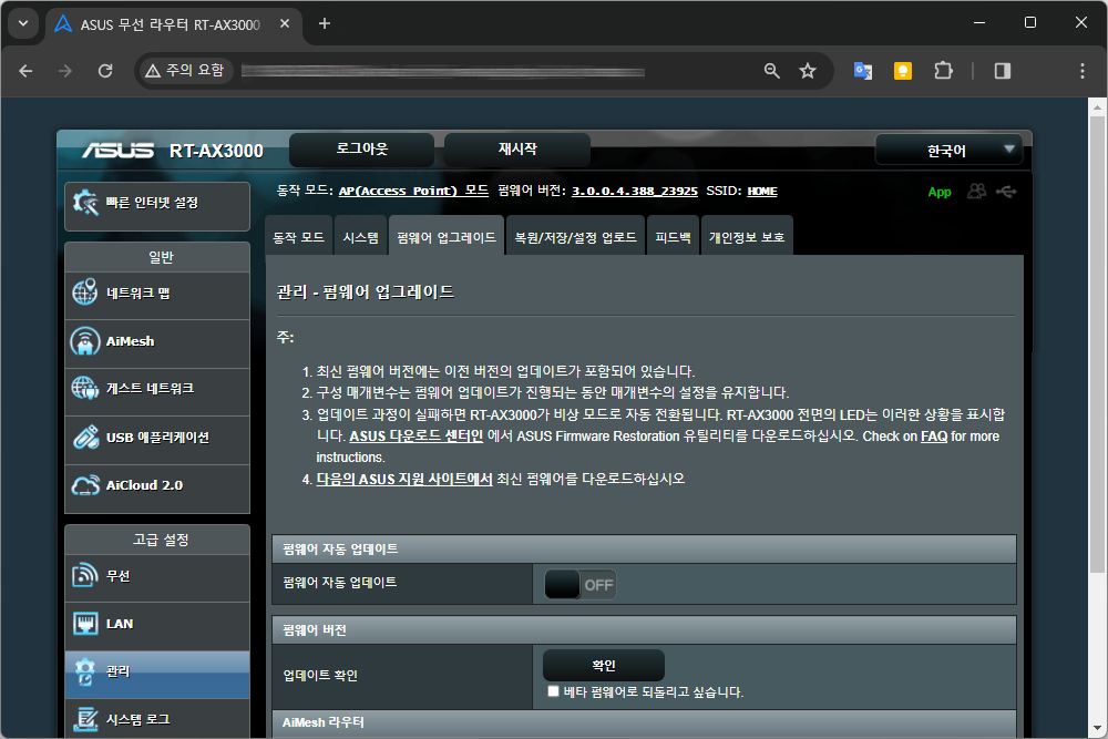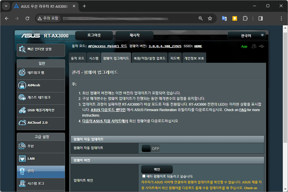 그리고 펌웨어 업그레이드를 선택하고 업데이트 확인을 누르면 “라우터가 ASUS 서버에 연결하여 펌웨어 업데이트를 확인할 수 없습니다. ASUS 제품 지원 사이트에서 최신 펌웨어를 다운로드 통해 수동 업데이트를 해 주십시오.” 라는 에러 메시지가 표시됩니다.