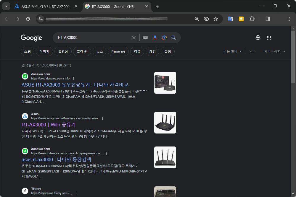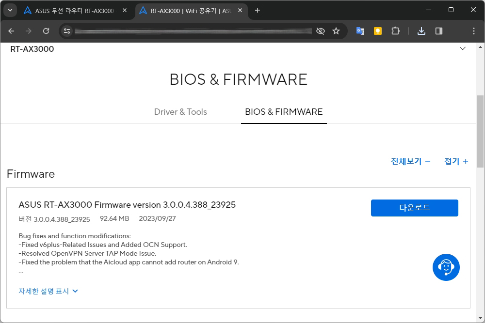 그러면 왼쪽 위에 있는 RT-AX3000이라는 문구를 드래그해서 오른쪽 마우스 버튼으로 Google에서 검색 메뉴를 선택하면 에이수스 공식 홈페이지에 접속할 수 있고 지원 BIOS & FIRMWARE 메뉴에서 최신 펌웨어를 다운로드 받을 수 있습니다.
