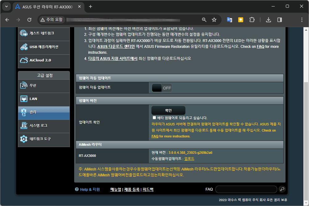 그리고 펌웨어 업그레이드를 선택하고 업데이트 확인을 누르면 “라우터가 ASUS 서버에 연결하여 펌웨어 업데이트를 확인할 수 없습니다. ASUS 제품 지원 사이트에서 최신 펌웨어를 다운로드 통해 수동 업데이트를 해 주십시오.” 라는 에러 메시지가 표시됩니다.