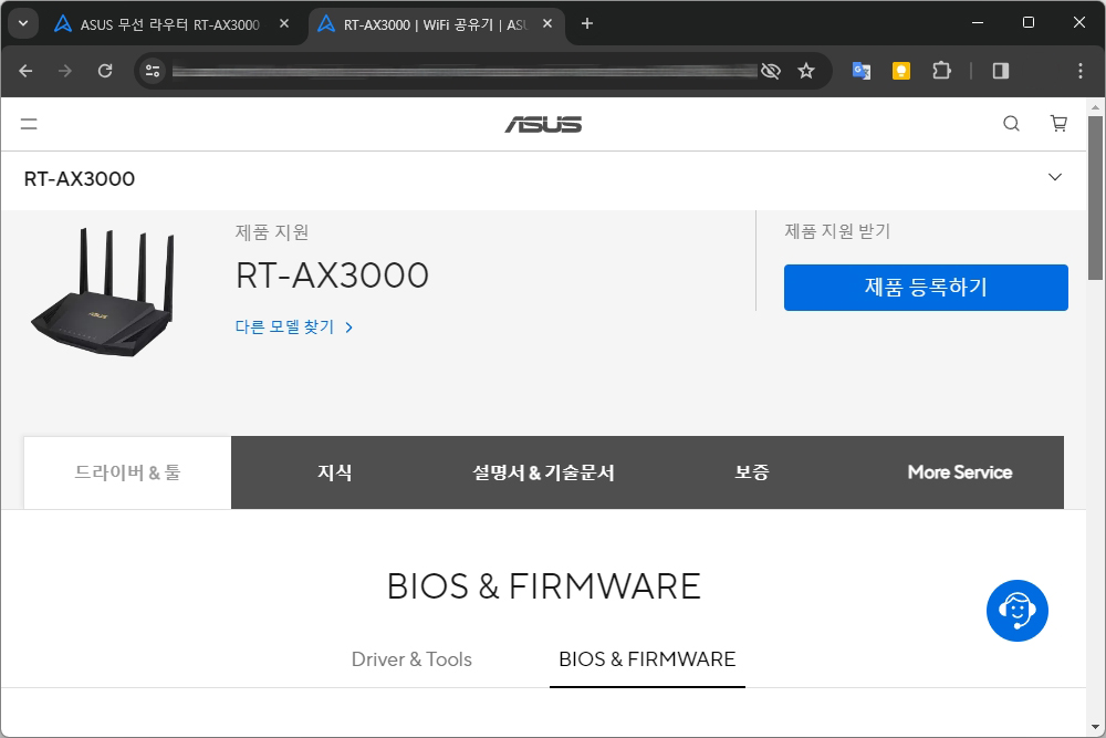 그러면 왼쪽 위에 있는 RT-AX3000이라는 문구를 드래그해서 오른쪽 마우스 버튼으로 Google에서 검색 메뉴를 선택하면 에이수스 공식 홈페이지에 접속할 수 있고 지원 BIOS & FIRMWARE 메뉴에서 최신 펌웨어를 다운로드 받을 수 있습니다.
