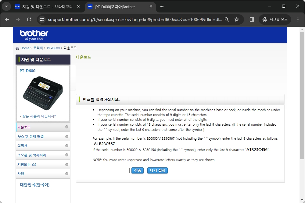 그리고 제가 사용하는 PT-D600만 그런지 모르겠지만 별도의 시리얼 넘버를 입력해야지만 소프트웨어를 다운로드 받을 수 있도록 구성되어 있습니다. 박스나 본체를 한 번 확인해 보시길 바랍니다.