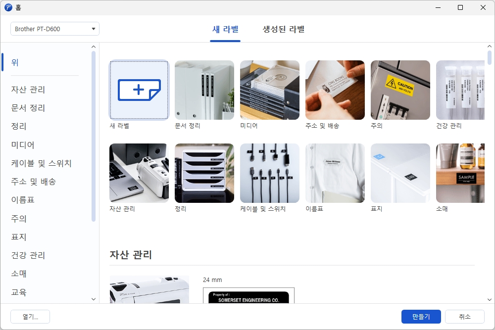 에디터 도구 P-touch Editor를 실행시키면 위와 같이 새 라벨을 작성하거나 아니면 문서 정리, 미디어, 주소 및 배송, 주의, 건강 관리, 자산 관리, 정리, 케이블 및 스위치, 이름표, 표지, 소매 등 다양한 프리셋들이 준비되어 있습니다. 그래서 자신의 필요에 맞게 사용할 수 있습니다.