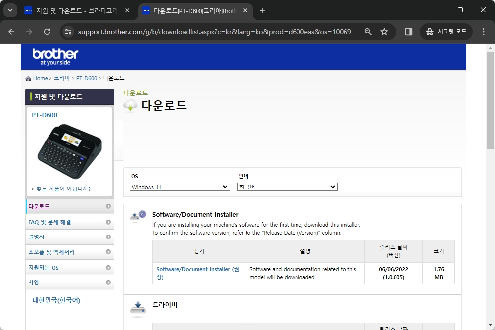 저는 제가 사용하고 있는 PT-D600이라는 제품을 선택했습니다. 그리고 OS 제품군 선택은 마이크로소프트 윈도우와 애플 맥OS(Mac) 모두를 지원하는 것을 확인할 수 있습니다. 그리고 Software/Document Installer와 드라이버 그리고 에디터 도구와 같은 프로그램들이 준비되어 있습니다.