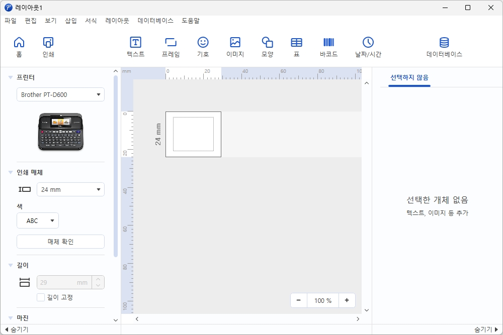 그리고 실제로 새 라벨을 작성하면 현재 브라더 라벨프린터에 연결된 인쇄 매체를 인식하고 텍스트나 프레임 그리고 기호, 이미지, 모양, 표, 바코드, 날짜/시간 등 다양한 내용들을 입력할 수 있습니다. 일반적인 워드프로세서와 같은 구조라서 어렵지 않게 활용할 수 있다는 장점이 있습니다.