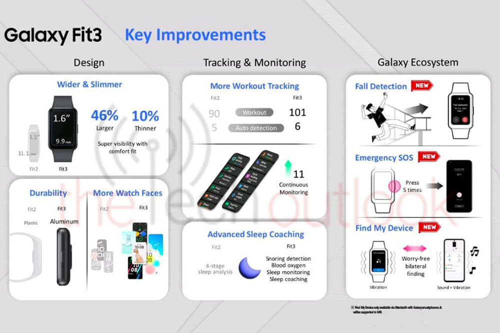 삼성 갤럭시 핏3(Galaxy Fit3)의 주요 특징을 살펴보면 핏2와 비교해서 디스플레이는 46% 커졌고 두께는 10% 얇아졌습니다. 그리고 체크할 수 있는 운동의 숫자와 자동 측정 기능 역시도 늘어난 것을 확인할 수 있습니다. 참고로 새롭게 추가된 기능은 낙상 감지와 긴급 SOS를 지원한다고 합니다.