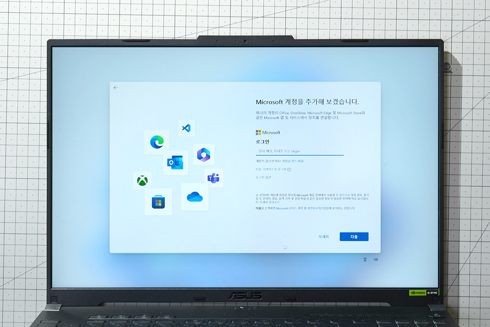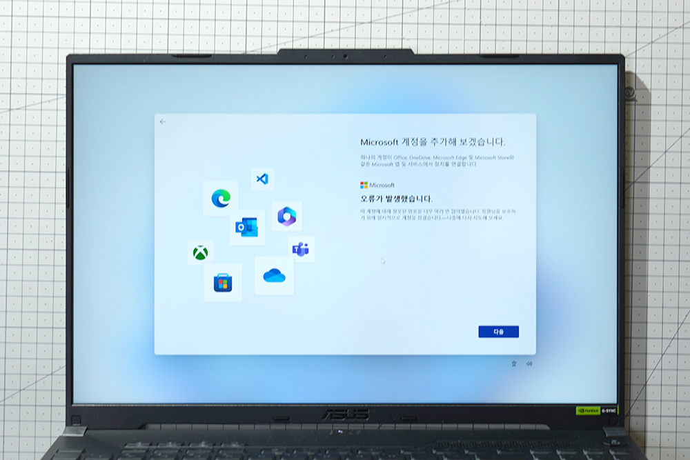 다음에는 와이파이(Wi-Fi)에 접속하면 위와 같이 마이크로소프트(Microsoft) 계정이 필요하다는 메시지가 표시됩니다. 계정이 있는 분들은 입력하면 되지만 노트북을 독립적으로 사용하려는 분들은 입력하기가 조금 꺼림칙합니다. 그래서 이럴 때는 로그인에 a 입력 그리고 암호 입력에 역시 a 를 입력하면 오류가 발생했습니다. 라는 메시지와 함께 다음 단계로 넘어갑니다.