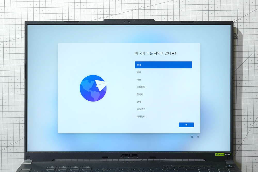 새로운 노트북을 구매하면 보통 윈도우11이 설치되어 있습니다. 만약 가격 측면의 이점 때문에 프리도스(FreeDos) 모델을 구매했다고 하더라도 마이크로소프트 Windows 11을 사용해야 합니다. 그리고 보통 위와 같이 “이 국가 또는 지역이 맞나요?”라는 메시지를 만나게 됩니다.
