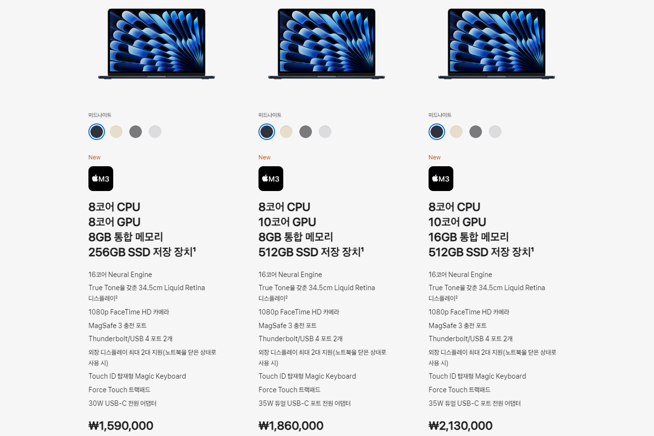 맥북에어 M3 13인치, 15인치의 가격을 살펴보면 13인치 모델은 GPU와 통합 메모리 그리고 저장 장치 용량에 따라서 159만원, 186만원, 213만원이 책정되었고 15인치 모델은 189만원, 216만원, 243만원에 구매할 수 있습니다.