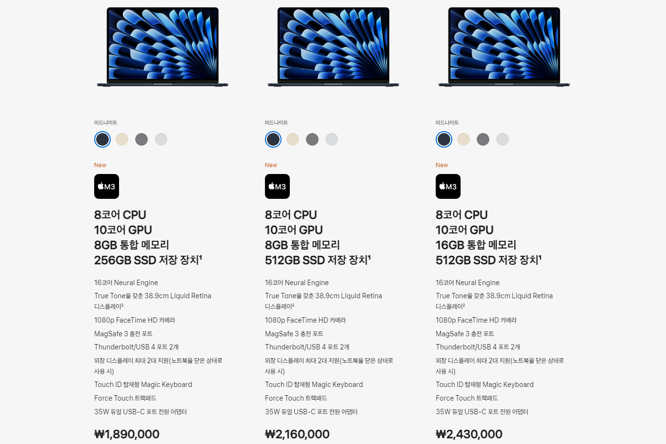 맥북에어 M3 13인치, 15인치의 가격을 살펴보면 13인치 모델은 GPU와 통합 메모리 그리고 저장 장치 용량에 따라서 159만원, 186만원, 213만원이 책정되었고 15인치 모델은 189만원, 216만원, 243만원에 구매할 수 있습니다.