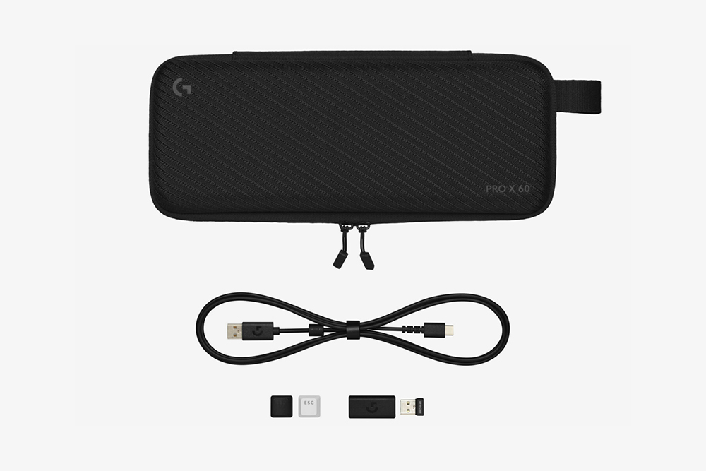 로지텍 PRO X 60 무선 게이밍 키보드의 구성품을 살펴보면 USB LIGHTSPEED 무선 어댑터와 USB-A to USB-C 충전 및 데이터 케이블 그리고 Logitech G 키캡과 휴대용 케이스가 포함되어 있습니다. 특히 파우치가 포함되어 있어서 자주 이동을 해야 하는 프로게이머들이 활용해도 좋습니다.