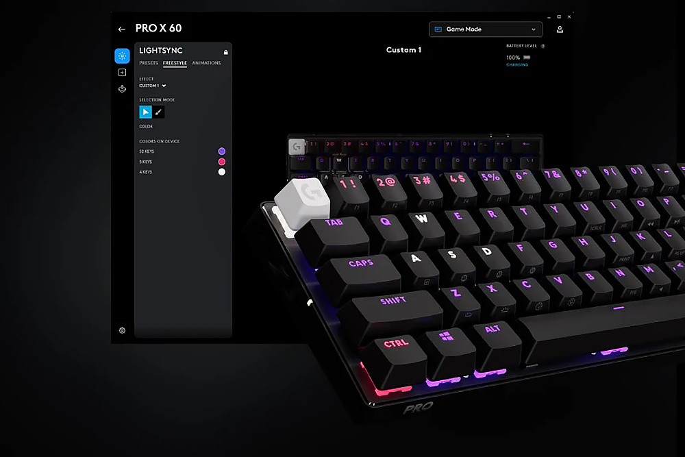 로지텍 PRO X 60 무선 게이밍 키보드는 로지텍 G HUB라는 전용 소프트웨어를 통해서 LIGHTSYNC RGB 조명을 컨트롤 할 수 있습니다. 그리고 모든키를 커스터마이징할 수 있는 기능도 지원합니다. 자신이 플레이하는 게임이나 사용하는 소프트웨어 맞게 설정해 주는 것을 추천합니다.