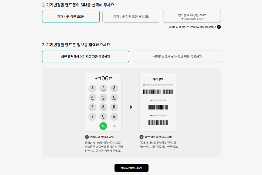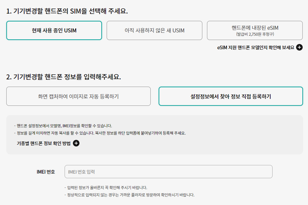 KT의 고객이라면 기기 변경할 스마트폰의 SIM을 선택해 주어야 합니다. 종류는 현재 사용 중인 USIM과 새 USIM 그리고 최신 스마트폰에서 지원하는 eSIM으로 구성되어 있고 기기 변경할 핸드폰의 정보(IMEI)를 입력해 주어야 합니다. 참고로 이 때 유심을 다른 공기계(자급제 단말기)에 연결한 상태에서 개통을 진행해야 합니다.