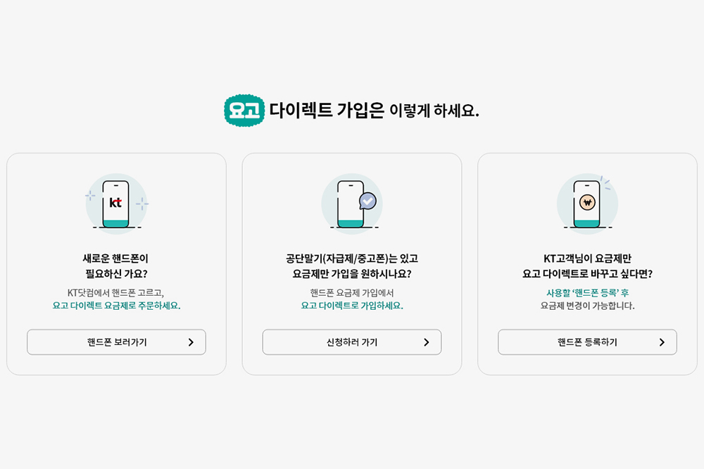 KT 요고 다이렉트 요금제에 가입하기 위해서는 우선 KT닷컴 홈페이지 접속해야 합니다. 참고로 저와 같이 기존에 KT를 사용하고 있는 사람이라면 핸드폰 등록하기 메뉴를 통해서 가입할 수 있습니다. 그리고 공단말기(자급제/중고폰)을 가진 분들도 가입해서 사용할 수 있습니다.