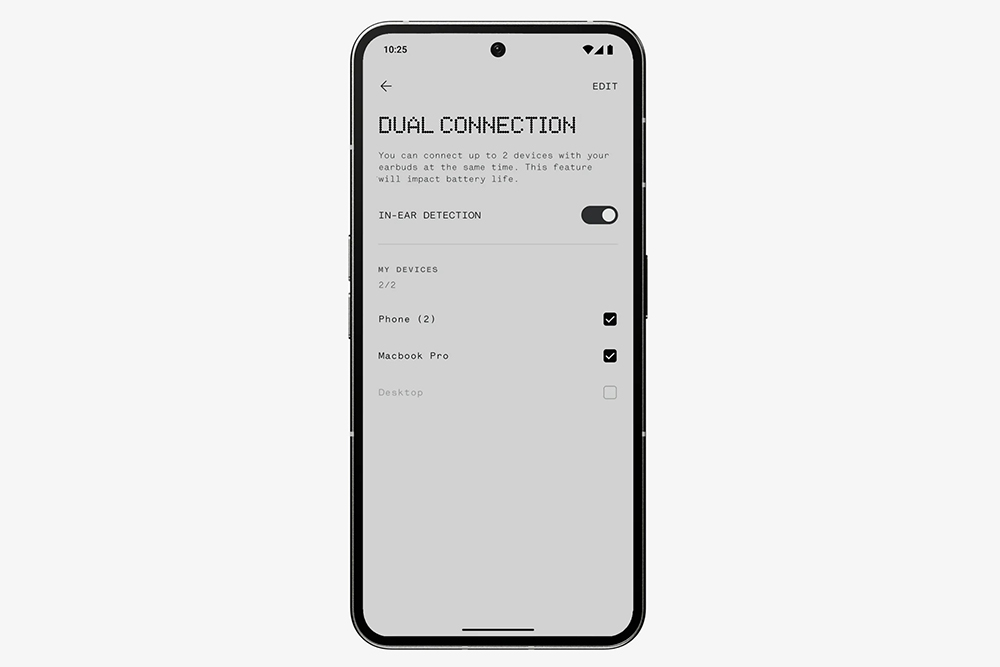 Nothing Ear (a) 블루투스 이어폰은 Nothing X 전용 앱을 각종 설정을 변경할 수 있습니다. 사용자 맞춤 EQ, 액티브 노이즈 캔슬링, 베이스 강화 알고리즘, 사용자 맞춤 제어, 듀얼 커넥션 기능을 제공하는데요. 한 번에 두 대의 제품에 연결해서 사용할 수 있다는 점이 편리한 부분이라고 생각되었습니다.