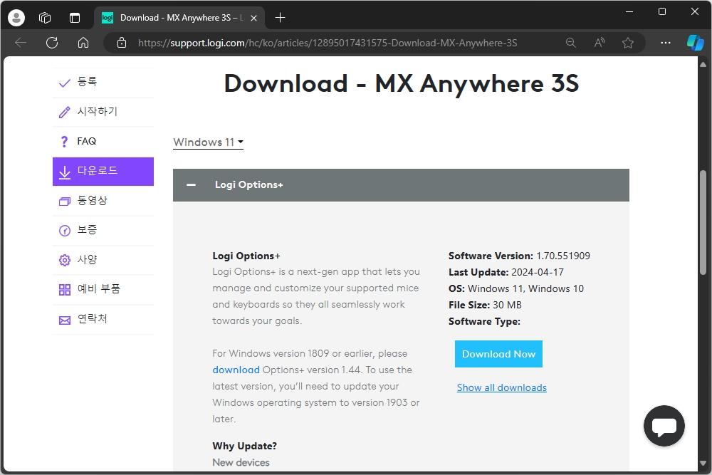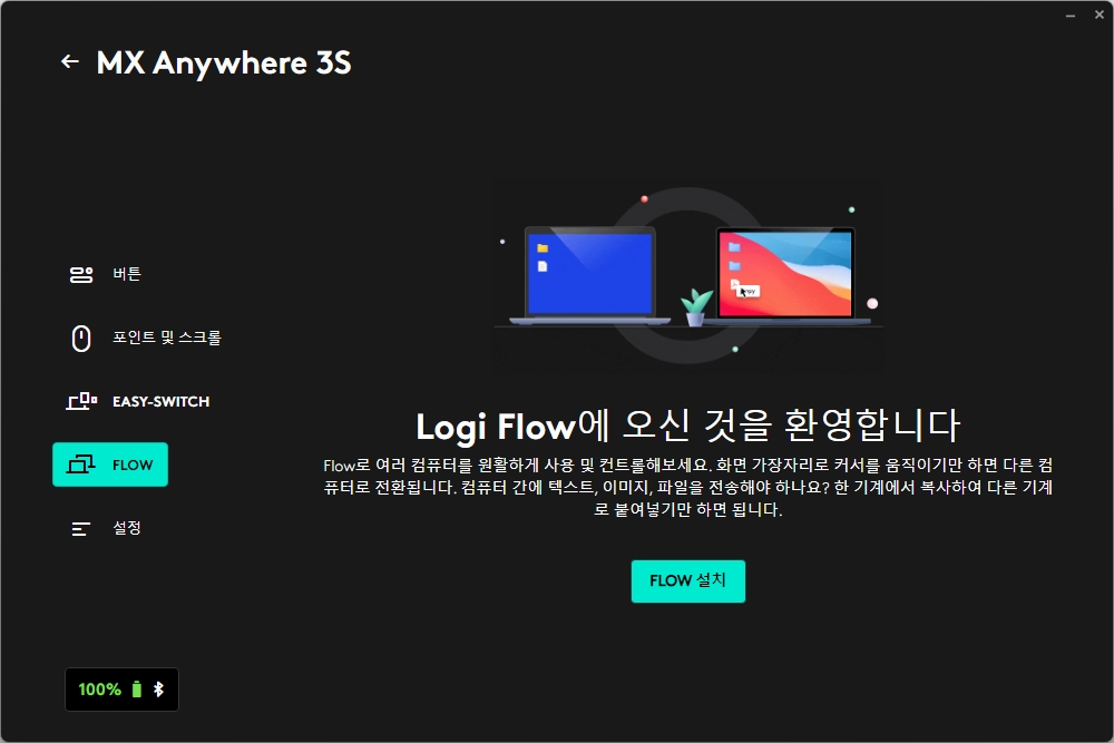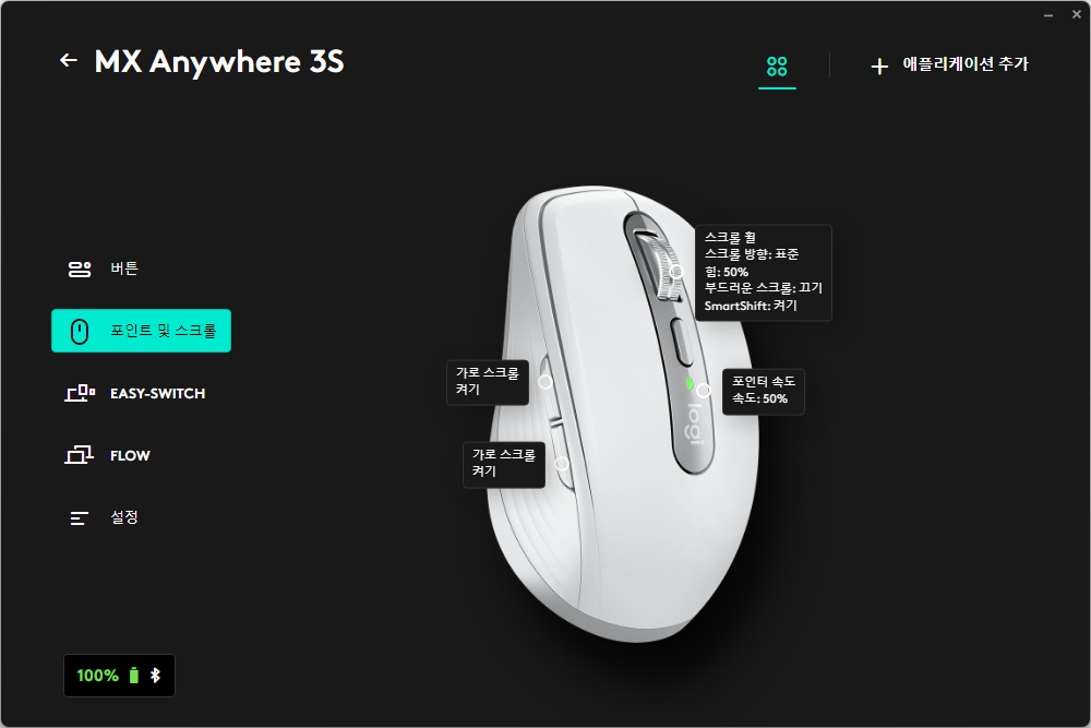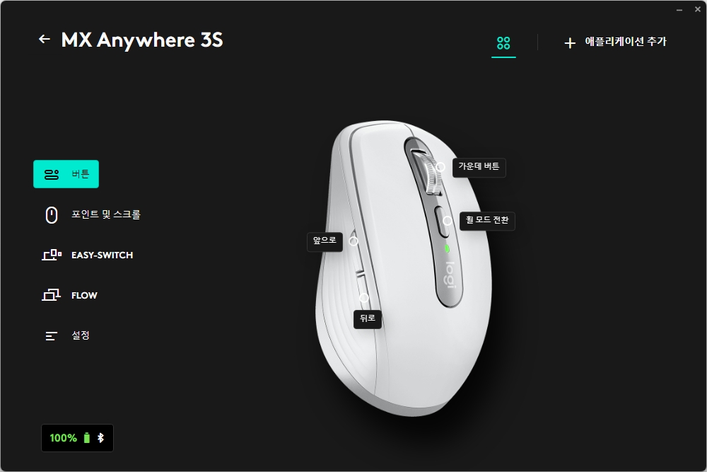 로지텍 MX 애니웨어 3S는 로지 옵션 플러스(Logi Options+)라는 전용 소프트웨어를 통해서 상태를 확인하고 설정을 변경할 수 있습니다. 그리고 프로그램은 로지텍 홈페이지에서 다운로드 받을 수 있습니다.