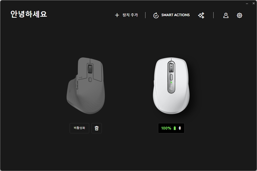 그리고 데스크톱 PC나 노트북의 블루투스 기능을 통해서 로지텍 MX 애니웨어 3S를 연결해 주면 로지 옵션 플러스에 마우스가 인식되는 것을 확인할 수 있습니다. 그리고 홈 화면에서는 현재 배터리 상태를 확인할 수 있습니다. 참고로 로지텍 MX 애니웨어 3S는 로지 볼트(Logi Bolt)를 통해서 연결할 수도 있지만 구성품에 수신기가 포함되어 있지는 않습니다.