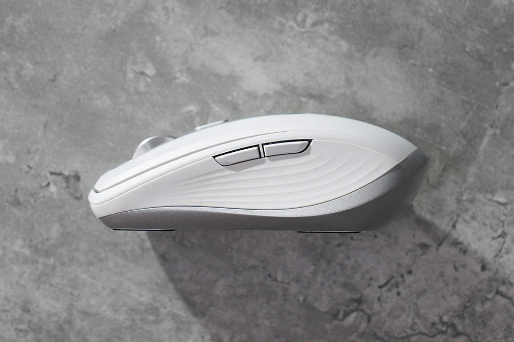 로지텍 MX 애니웨어 3S의 옆쪽은 실리콘 사이드 그립이 배치되어 있어서 손에서 잘 미끄러지지 않습니다. 그리고 왼쪽에 앞/뒤로 가기 버튼이 준비되어 있습니다.