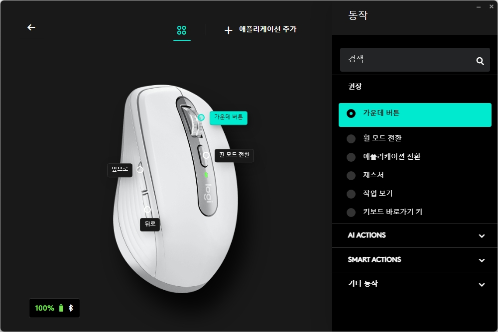 로지 옵션 플러스의 기능을 살펴보면 버튼에 다양한 기능을 설정할 수 있도록 구성되어 있습니다. 여유 버튼이 많은 것은 아니라서 휠 모드 전환 버튼에 alt + f4나 ctrl + w 정도를 할당해서 사용하는 것을 추천합니다. 그리고 최근 유행하고 있는 인공지능을 위해서 AI ACTIONS 기능을 지원한다는 점도 재미있는 부분입니다.