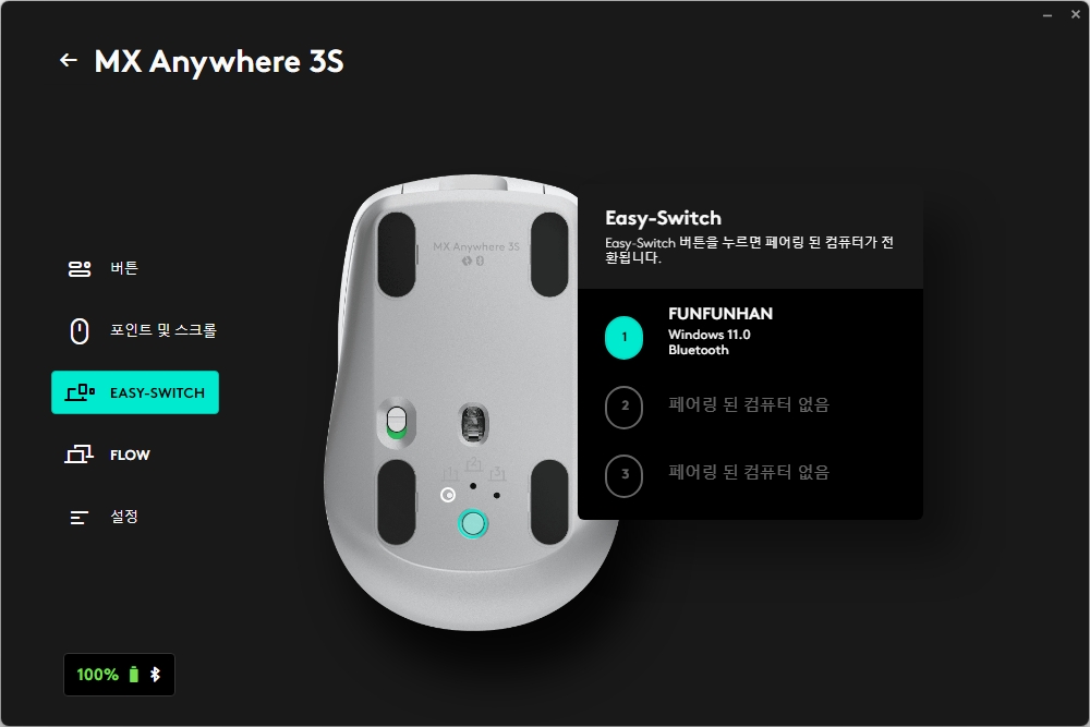 이지 스위치(EASY-SWITCH) 기능을 이용하면 로지텍 MX 애니웨어 3S에 등록된 3개의 페어링 제품을 확인할 수 있습니다. 그리고 로지 플로우(Logi Flow) 기능을 이용하면 여러 대의 컴퓨터를 하나의 마우스로 관리할 수 있습니다. 데스크톱 PC와 노트북을 한 번에 사용하는 분들에게 유용한 옵션입니다.