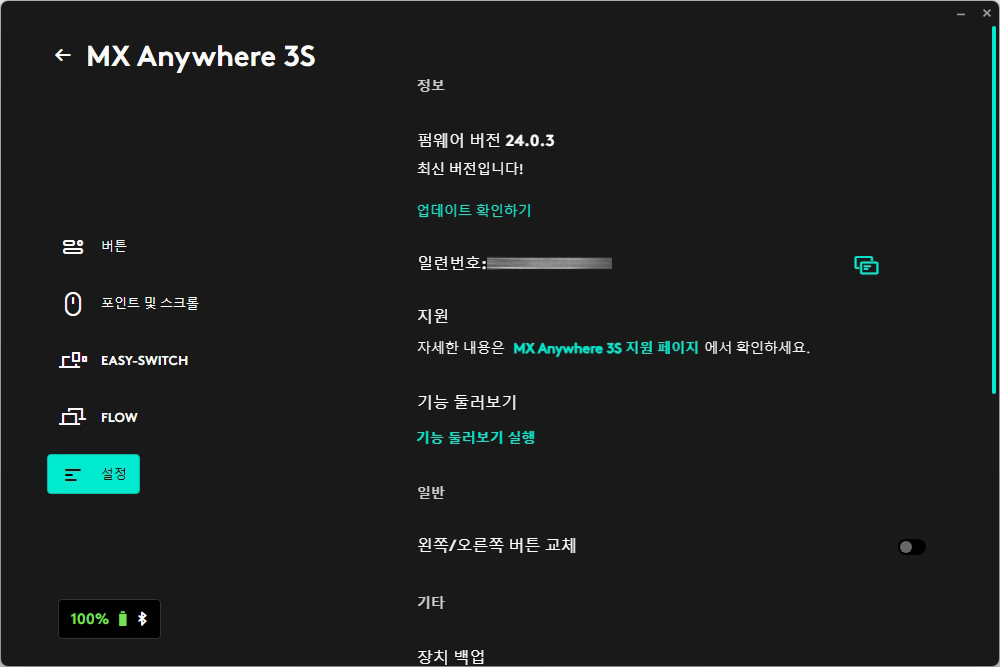 설정에서는 펌웨어 버전과 함께 일련번호를 확인할 수 있습니다. 그 외에도 왼쪽/오른쪽 버튼을 소프트웨어적으로 교체하거나 장치 설정을 백업하고 기본값으로 복원할 수 있는 기능도 준비되어 있습니다. 일부 기능들은 로그인이 필요합니다.