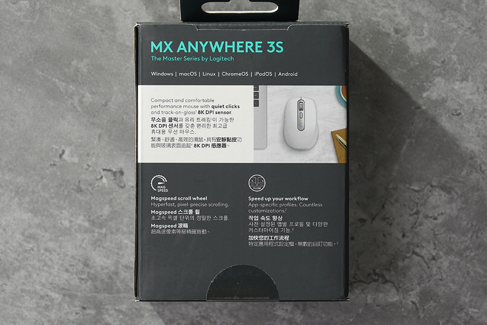 박스의 뒷면을 살펴보면 로지텍 MX 애니웨어 3S의 특징이 설명되어 있는데요. 무소음 클릭과 유리에서도 트래킹을 할 수 있는 8K DPI 센서가 탑재되었다는 문구가 표시되어 있습니다. 그리고 제가 로지텍의 마우스에서 가장 좋아하는 기술 중의 하나인 초고속 MAGSPEED 전자 마그네틱 스크롤 휠이 내장되었습니다.