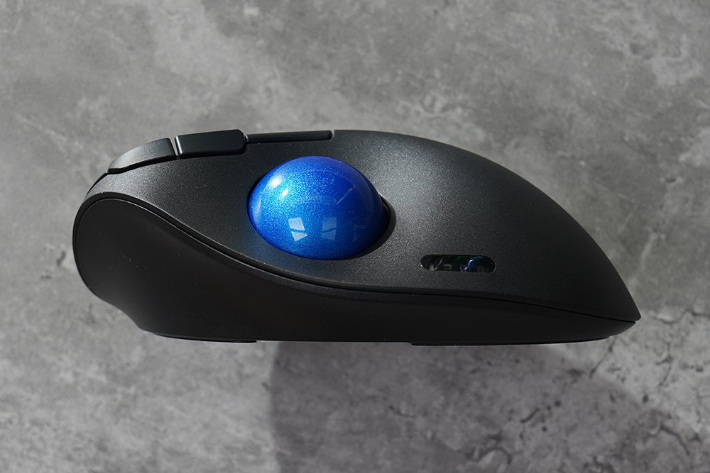 켄싱턴 TB450 무선 트랙볼 마우스의 옆면을 살펴보면 트랙볼이 준비되어 있고 오른쪽의 작은 상태 표시창을 통해서 2.4GHz 무선과 2개의 블루투스 장치를 전환할 수 있고 전환 버튼은 휠 뒤쪽에 배치되어 있습니다.