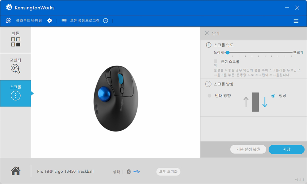 포인터 메뉴에서는 포인트 속도를 설정하거나 가속 활성화 기능을 설정할 수 있습니다. 참고로 DPI는 400, 800, 1200, 1600 중에서 선택할 수 있습니다. 자신의 모니터 크기에 따라서 설정하는 것을 추천합니다. 그리고 스크롤에서는 스크롤 속도와 방향을 설정할 수 있습니다. 프로그램 자체가 상당히 직관적이어서 큰 어려움 없이 활용할 수 있을 것으로 예상합니다.