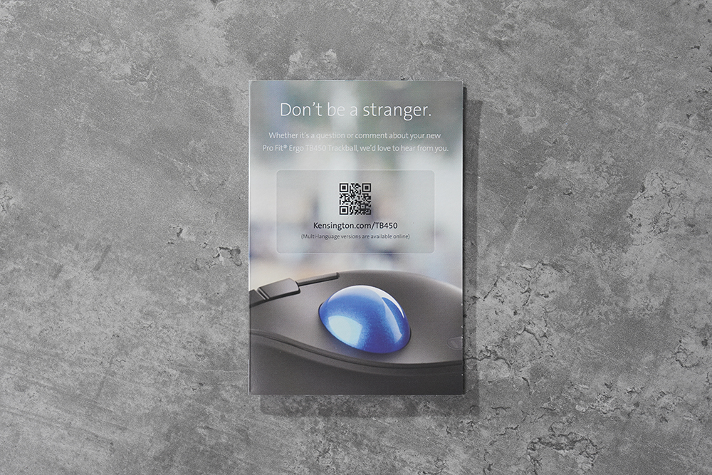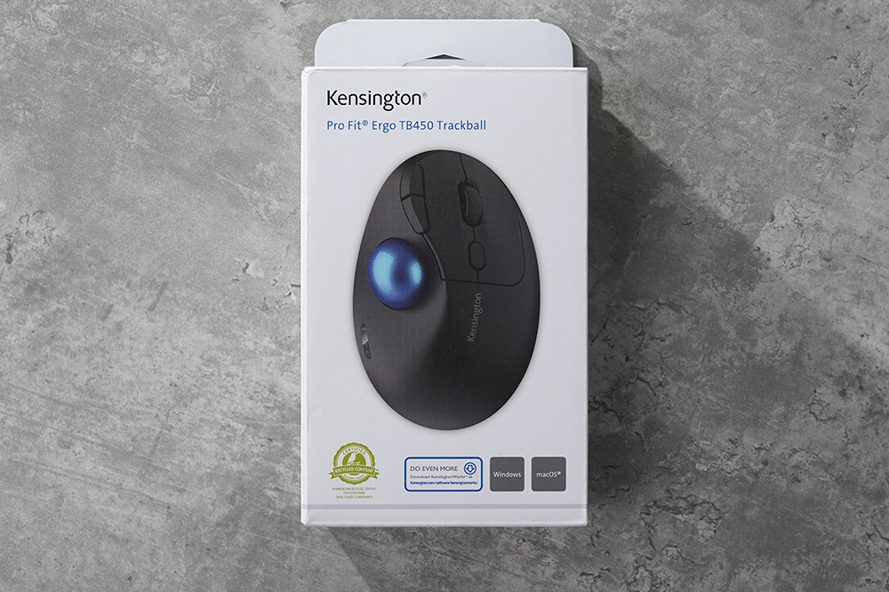 켄싱턴 TB450 무선 트랙볼 마우스의 박스는 심플한 스타일로 디자인되었고 전면에는 마이크로소프트 윈도우와 애플 맥OS를 지원한다는 문구가 표시되어 있습니다. 그리고 전용 소프트웨어를 다운로드 받을 수 있는 링크 주소도 인쇄되어 있습니다.