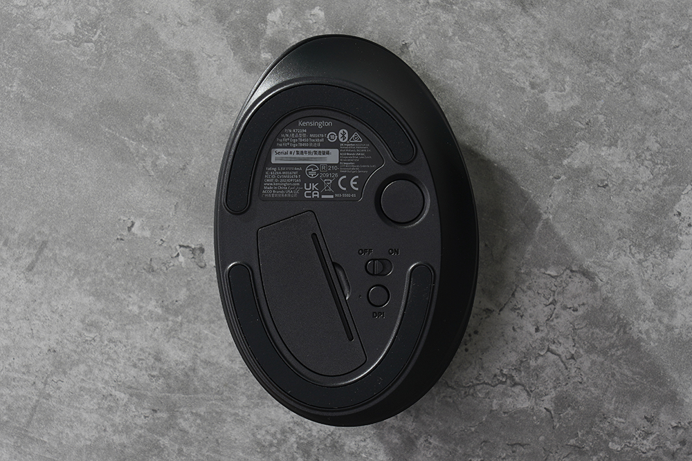 바닥을 살펴보면 전원 스위치와 DPI 전환 버튼 그리고 건전지 커버가 준비되어 있습니다. 그리고 오른쪽에 배치된 버튼을 눌러서 트랙볼을 분리할 수 있습니다. 예전에 볼마우스를 사용해본 분들은 아시겠지만 볼의 경우에는 주기적으로 청소를 해주어야 합니다.