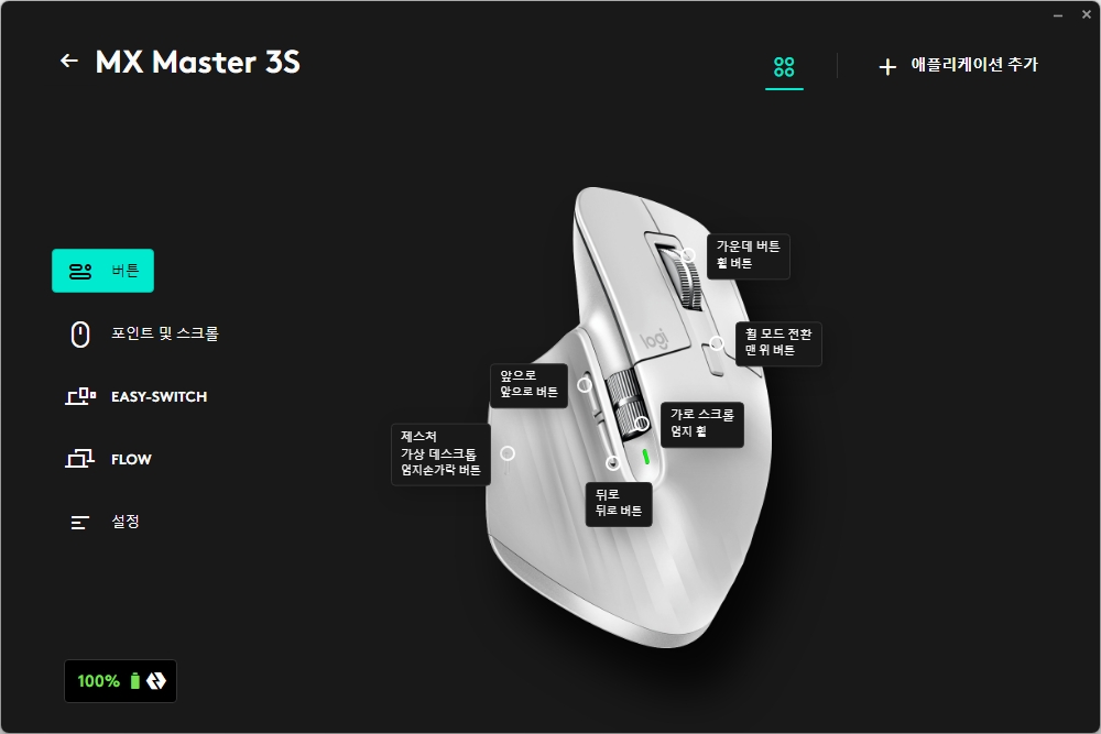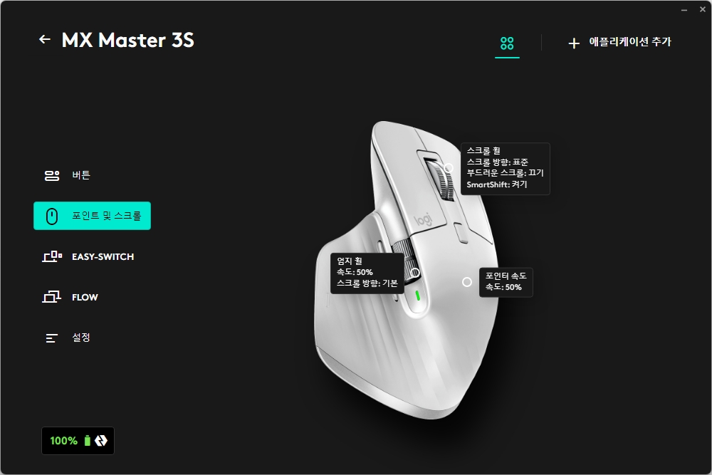 로지텍 MX Master 3S 무선 마우스는 로지 옵션 플러스(Logi Option+)라는 전용 소프트웨어를 통해서 설정을 변경할 수 있습니다. 가능하면 설치해서 사용하는 것을 추천합니다.
