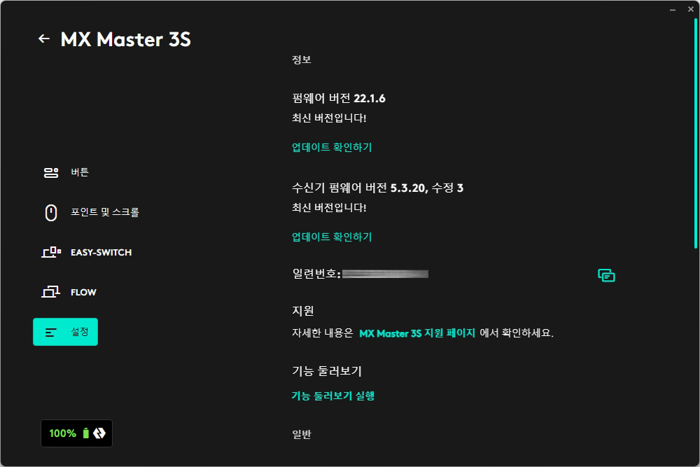 로지 플로우(Logi Flow)는 여러 대의 컴퓨터를 하나의 마우스와 키보드로 관리할 수 있게 만들어 주는 기능입니다. 참고로 키보드도 해당 기능을 지원하는 로지텍의 제품을 구매해야 합니다. 설정에서는 로지텍 MX Master 3S 무선 마우스와 로지 볼트(Logi Bolt) 수신기의 펌웨어 버전을 확인할 수 있습니다.