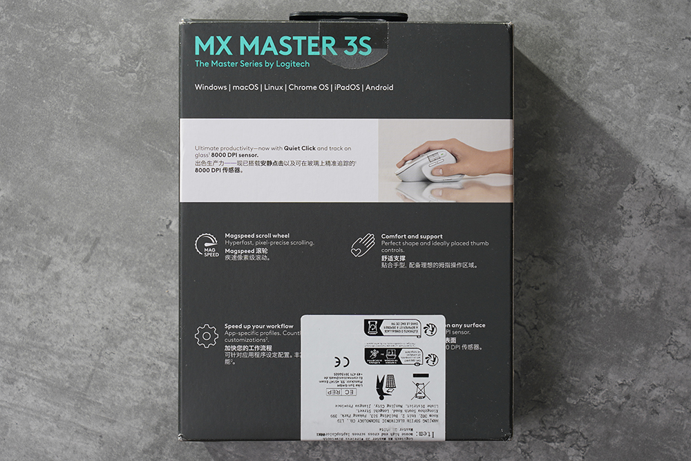 박스의 뒷면을 살펴보면 로지텍 MX Master 3S 무선 마우스의 특징들이 설명되어 있는데요. 핵심이라고 할 수 있는 부분은 8K 다크필드 센서가 탑재되어서 유리 위에서도 사용할 수 있고 초고속 마그네틱 스크롤 휠을 채택했습니다.