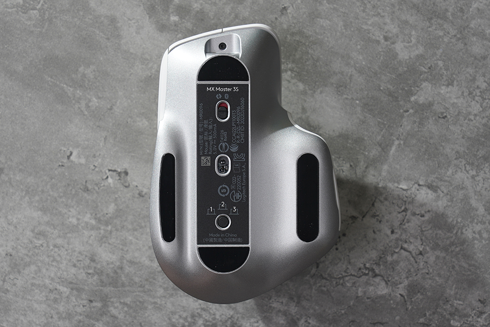 로지텍 MX Master 3S 무선 마우스의 바닥을 살펴보면 전원 버튼과 함께 8000 DPI까지 설정할 수 있는 8K 다크필드 센서가 탑재되었습니다. 그리고 아래쪽에 이지 스위치 기능을 지원하는 버튼이 배치되어 있는데요. 블루투스 기능을 사용하기 위해서는 버튼을 길게 누르면 페어링 모드로 들어갑니다.