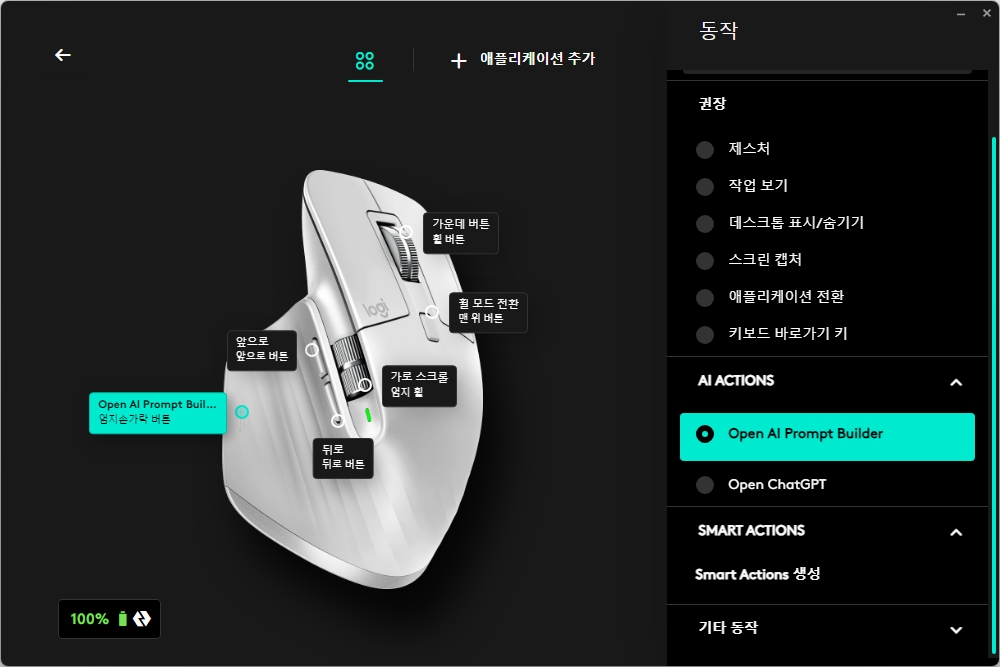 로지 옵션 플러스(Logi Option+)의 버튼 메뉴를 확인해 보면 최근 유행하고 있는 인공지능 기능은 물론이고 다양한 기능을 할당해서 사용할 수 있습니다. 휠 모드 전환이나 엄지 손가락 버튼에 자신이 자주 사용하는 기능을 설정해서 사용하는 것을 추천합니다.