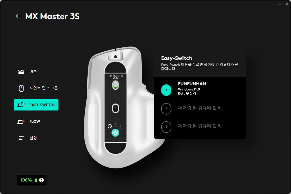 포인트 및 스크롤에서는 스크롤 휠과 엄지 휠의 다양한 설정을 변경할 수 있습니다. 세밀하게 세팅할 수 있다는 점이 유용한 부분입니다. 이지 스위치(EASY-SWITCH) 기능을 살펴보면 로지텍 MX Master 3S 무선 마우스에 페어링된 장치의 이름을 확인할 수 있습니다.