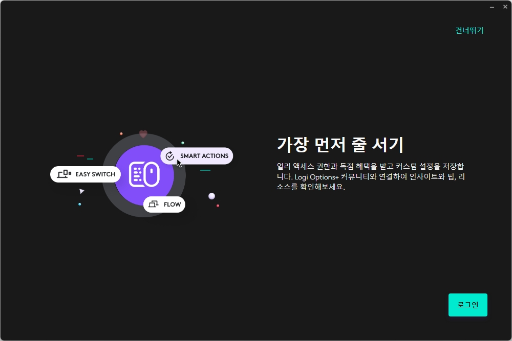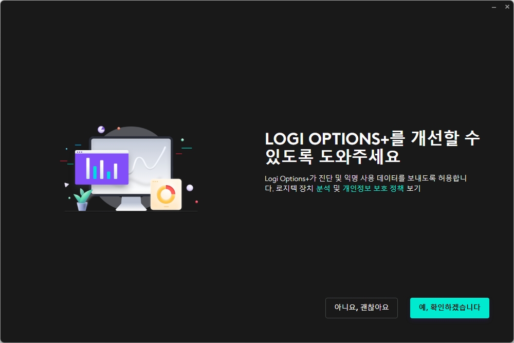 로지 옵션 플러스(Logi Option+)를 설치할 때 진단 및 익명 사용 데이터 공유 관련 메뉴가 표시되는데요. 이때 아니요, 괜찮아요. 를 선택해 주면 되고 로그인 관련 기능은 오른쪽 위에 있는 건너뛰기를 통해서 진행할 수 있습니다.
