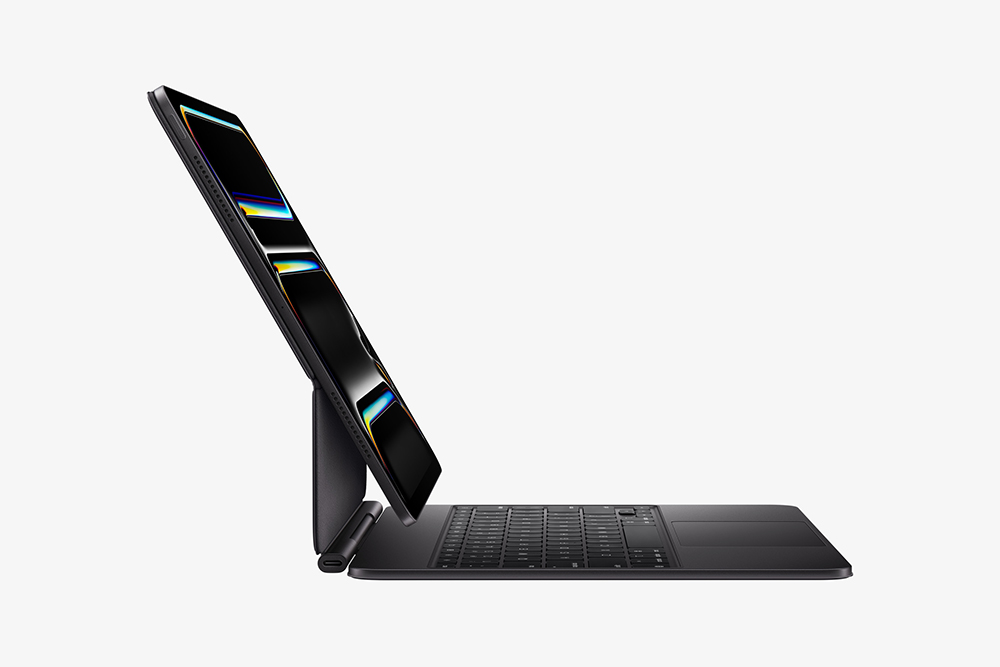 아이패드 프로 M4 모델용 매직 키보드는 기계 가공된 알루미늄 소재의 견고한 힌지가 적용되었습니다. 그래서 자신이 원하는 각도로 아이패드를 조절해서 사용할 수 있습니다.