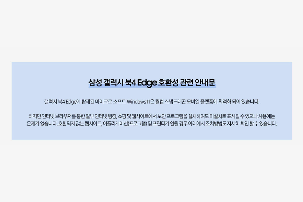 그런데 삼성 갤럭시 북4 엣지의 가장 큰 단점은 바로 호환성이라고 할 수 있는데요. 기존에 일반적으로 사용되던 x86 기반의 인텔이나 AMD의 제품이 아닌 스마트폰이나 태블릿에 사용된 ARM 코어 기반의 퀄컴 Snapdragon X Elite 프로세서를 탑재했습니다. 그래서 호환성 관련 문제가 있을 수 있습니다.