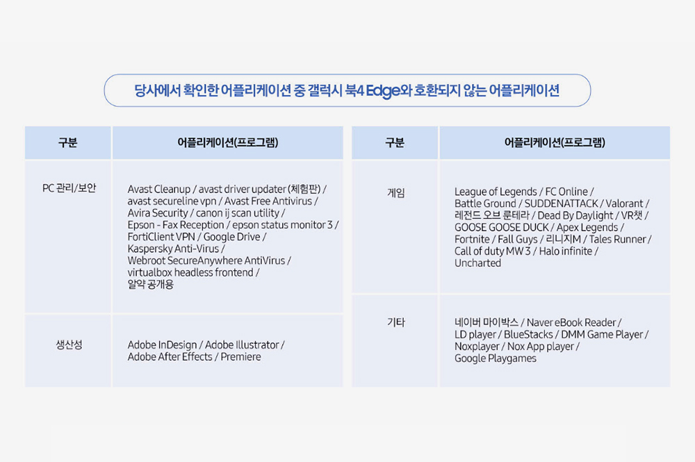 그런데 삼성 갤럭시 북4 엣지의 가장 큰 단점은 바로 호환성이라고 할 수 있는데요. 기존에 일반적으로 사용되던 x86 기반의 인텔이나 AMD의 제품이 아닌 스마트폰이나 태블릿에 사용된 ARM 코어 기반의 퀄컴 Snapdragon X Elite 프로세서를 탑재했습니다. 그래서 호환성 관련 문제가 있을 수 있습니다.