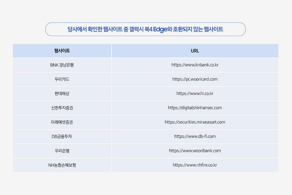 우선 삼성 갤럭시 북4 엣지에서 호환되지 않은 웹사이트의 경우에는 BNK 경남은행, 우리카드, 현대해상, 신한투자증권, 미래에셋증권, DB금융투자, 우리은행, NH농협손해보험 등이 있습니다. 이러한 호환성은 점차 개선될 수 있을 것으로 예상합니다.