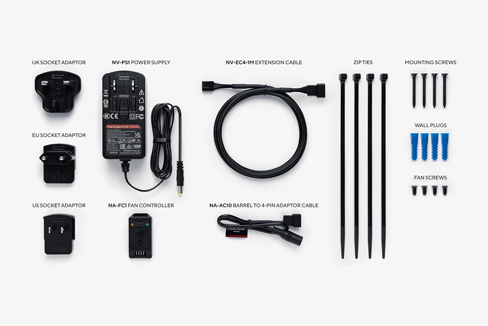 녹투아 NV-FS1 탁상용 선풍기의 패키지는 블랙 컬러로 제작되었고 유니크한 컬러가 오른쪽에 약간 사용된 것을 확인할 수 있습니다. 그리고 구성품에는 어댑터와 다양한 전원 커넥터 그리고 연장 케이블과 케이블 타이 등이 제공됩니다. 액세서리들이 예사롭지는 않은 편입니다.