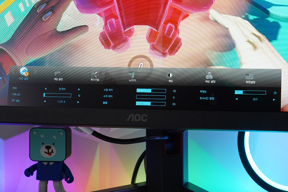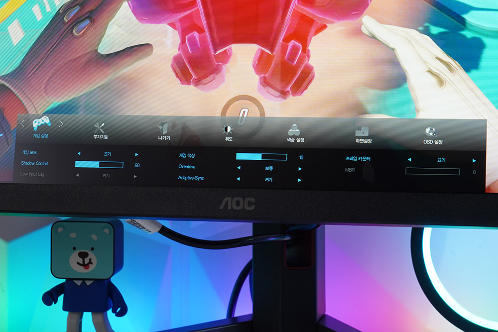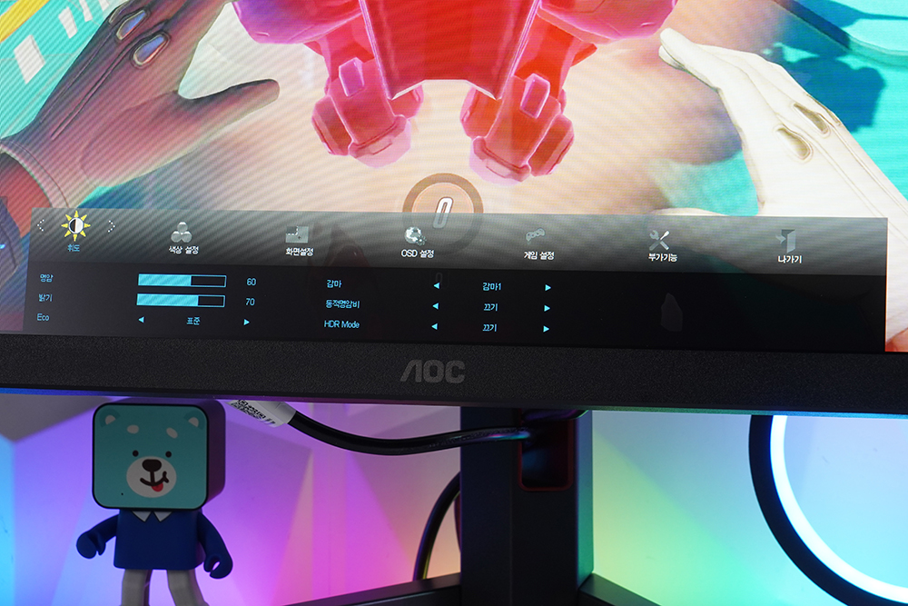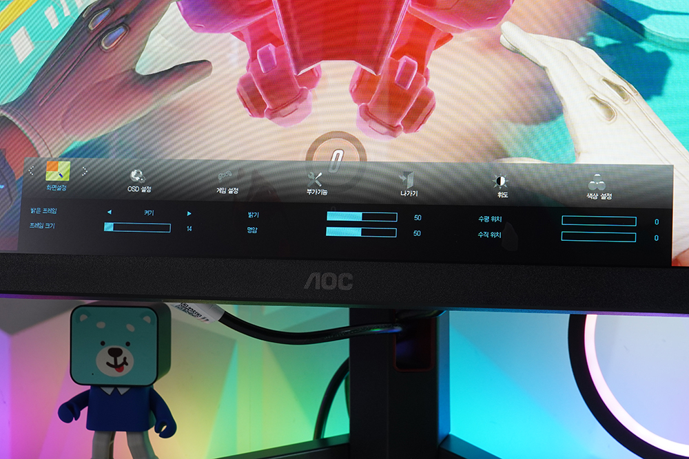 화면 설정에서는 밝기 프레임을 켜고 끌 수 있고 OSD 설정에서는 언어를 변경하거나 위치 그리고 지속 시간 등을 설정할 수 있습니다. 필요에 따라서 세팅해 주는 것을 추천합니다.