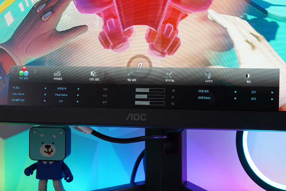 알파스캔 AOC Q27G4 게이밍 모니터의 OSD 기능을 살펴보면 우선 휘도에서는 명암과 밝기 그리고 Eco와 같은 기능들을 설정할 수 있습니다. 그리고 색상 설정 설정에서는 색 온도를 조절하거나 로우블루 모드를 켜고 끌 수 있습니다. 메뉴들은 상당히 직관적인 편이라고 생각되었습니다.