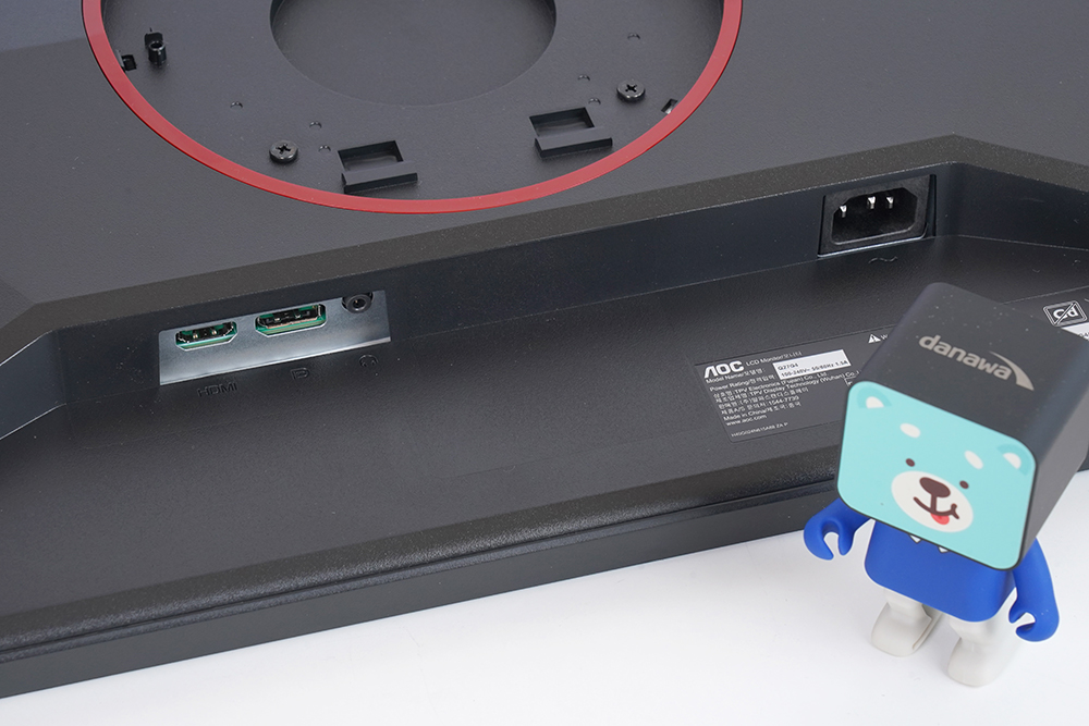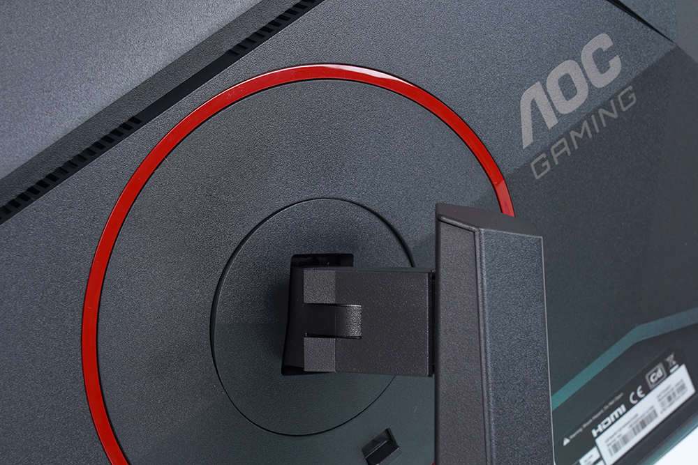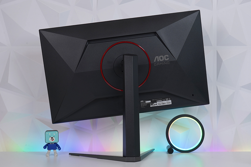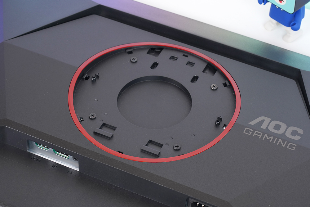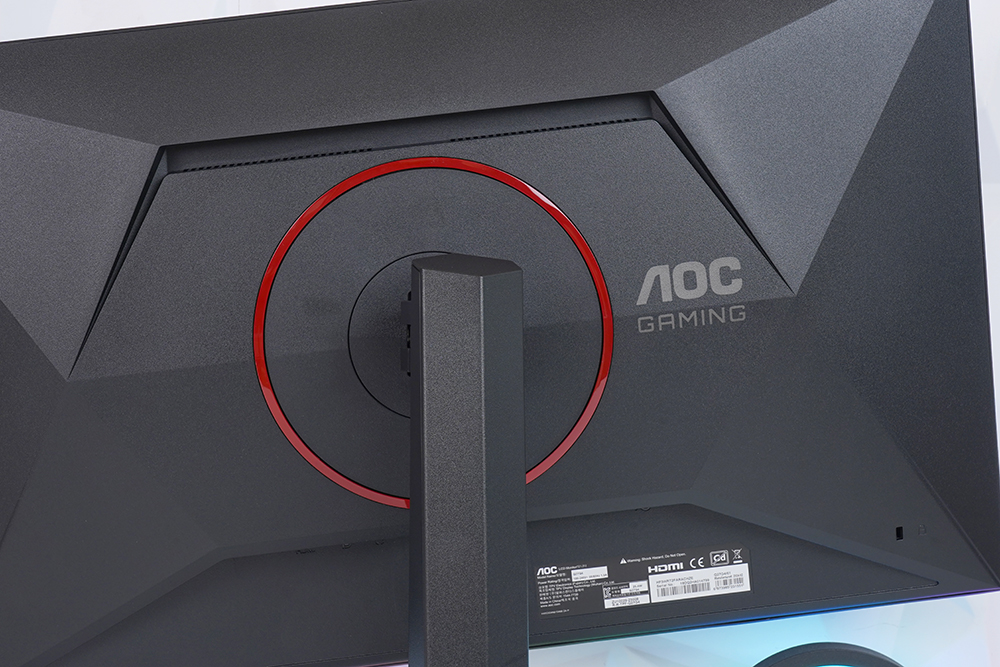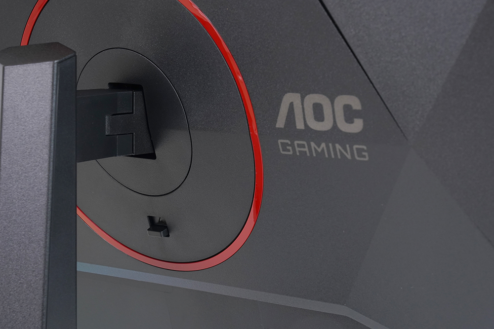 뒷면을 자세하게 살펴보면 중앙에 레드 컬러의 링이 배치되어 있고 오른쪽에 AOC GAMING이라는 문구가 각인되어 있습니다. 그리고 아래쪽에 켄싱턴 락이 준비되어 있어서 공개된 장소에 알파스캔 AOC Q27G4 게이밍 모니터를 설치해서 사용할 수 있습니다.